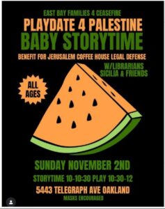Sunday November 2nd, 10am-12pm for a storytime fundraiser for @jerusalemcoffeehouse’s legal defense. Children’s librarian Sicilia will lead a toddler/baby storytime from 10-10:30, followed by free play and games. All ages are welcome!