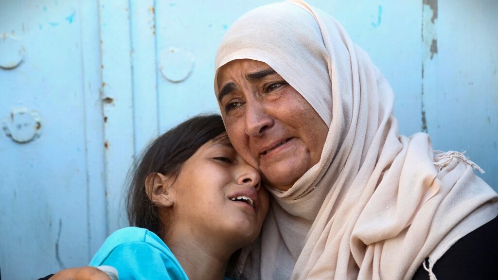 A woman and a child react after identifying the body of a family member at the Nasser hospital, among Palestinians killed in Israeli strikes on the al-Mawasi refugee camp and the eastern neighborhoods of Khan Yunis in the southern Gaza Strip, on July 24, 2025.