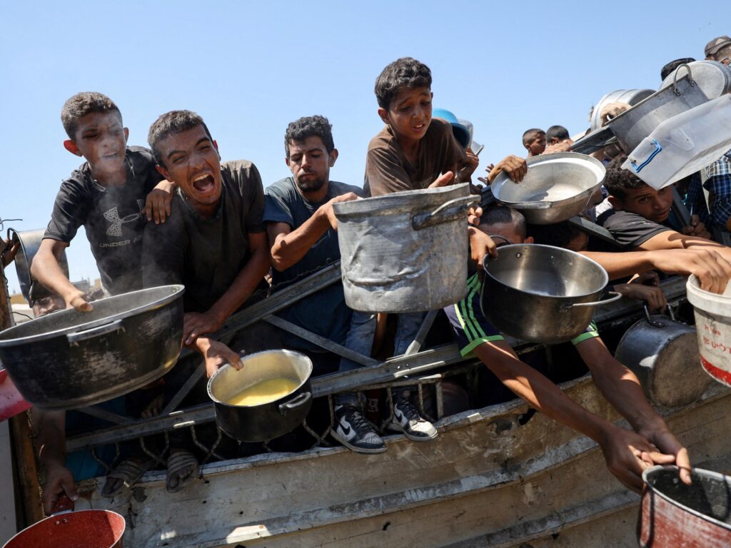Palestinians wait to receive food from a charity kitchen, amid a hunger crisis, in Gaza City, July 24, 2025 [Khamis Al-Rifi/Reuters]
